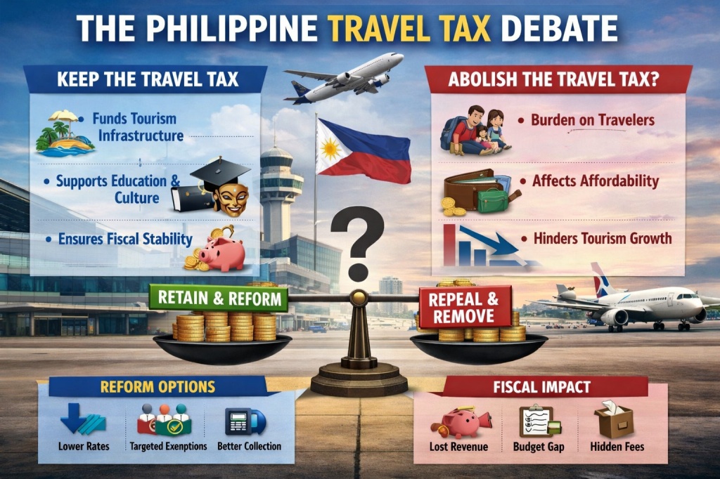 The debate over the Philippine Travel Tax encapsulates deeper questions about public finance, equity, competitiveness, and national development priorities. While legitimate concerns have been raised about the cost burden on travelers and the need for equitable treatment, abolition of the Travel Tax is not the most effective policy solution. Such a move would weaken a dedicated funding stream for tourism and related programs and would impose hidden costs through general taxation or new administrative charges.